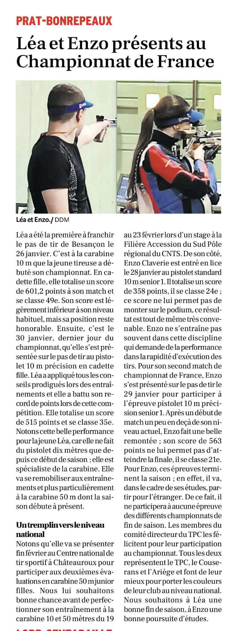 Léa et Enzo Claverie se sont déplacés à Besançon du 26 au 31 janvier 2026 pour participer au championnat de France 10 mètres. Qualifiés dans plusieurs disciplines chacun, ils ont représenté le TPC au rang national tant en carabine qu’en pistolet. Voici leur résultats ; CARABINE 10 METRES * Cadet fille : – Claverie Léa totalise … Lire la suite