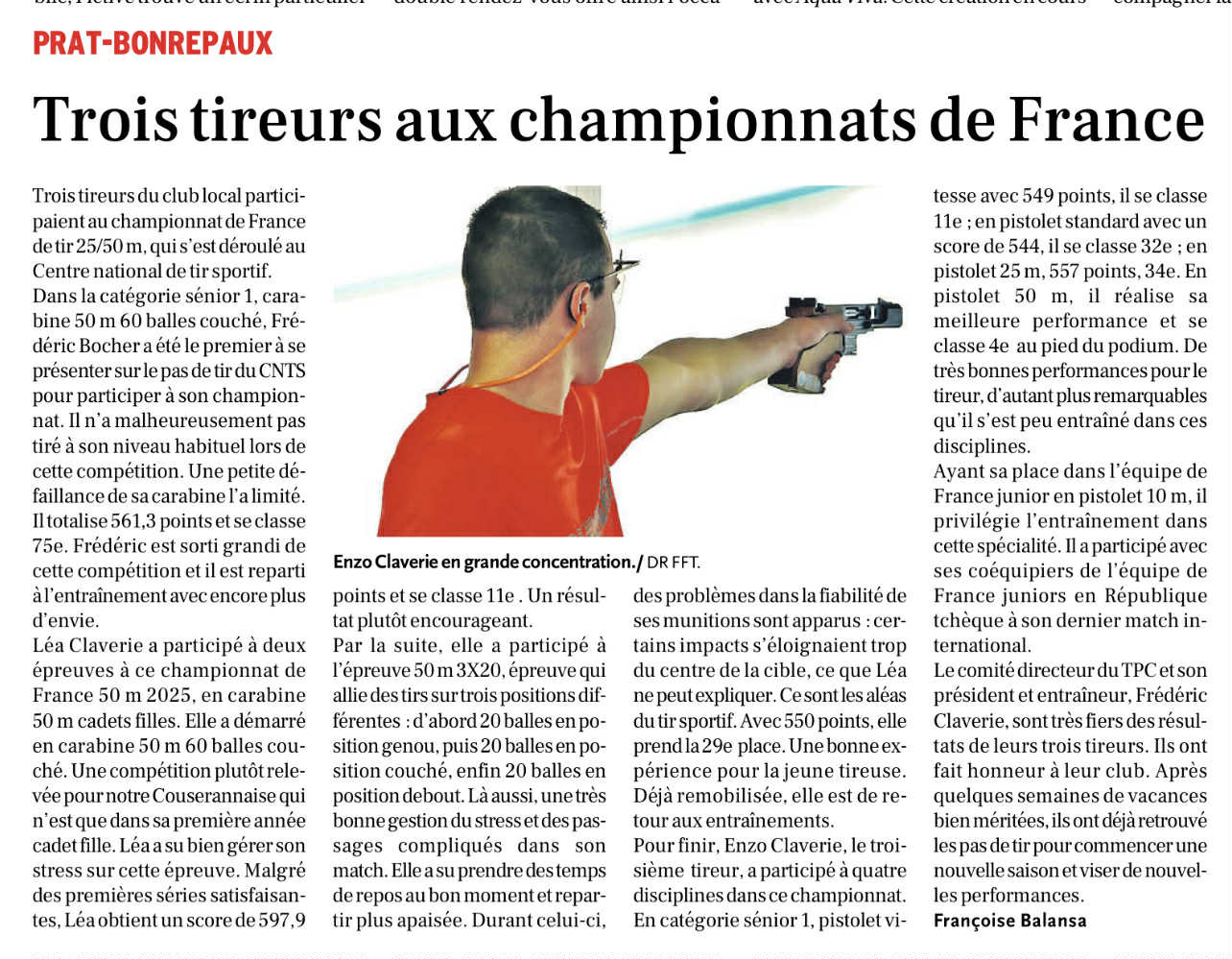 Seule Lana Senzier s’est rendue au concours amical 10 mètres au club Lourdais ce dimanche 28 septembre 2025. Voici son résultat : ECOLE DE TIR PISTOLET 10 METRES Minime fille – Senzier Lana totalise 316 points et se classe 1ère Merci Lana d’avoir représenté le TPC lors de ce concours amical et bonne chance pour … Lire la suite